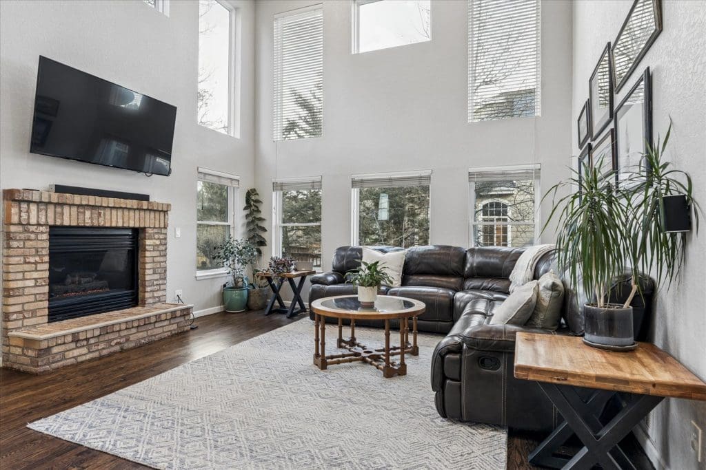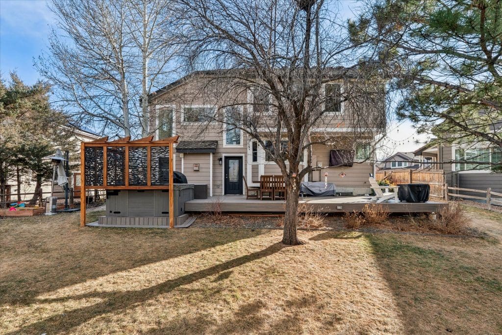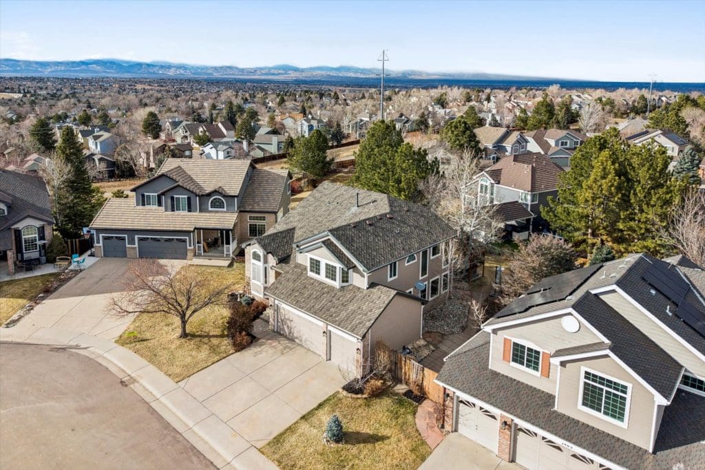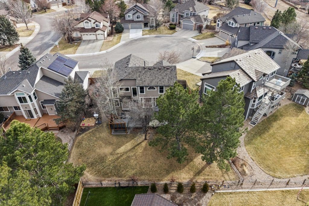 SPECTACULAR MOUNTAIN VIEWS!! A beautifully updated home on a premier cul-de-sac lot in Lone Tree. Sun-filled windows in various sizes nicely complement each room, creating a warm and welcoming feeling throughout. Gleaming hardwood flooring on main & lower levels. Open floor plan is ideal for entertaining and comfortable daily living. Cooking will be a pleasure in the Gourmet Dream Kitchen with windows capturing the AMAZING MOUNTAIN VIEWS. Abundance of attractive white cabinetry and countertops, including a huge island with 4 burner gas cooktop. Stainless appliances, pantry and spacious eating area surrounded by windows. Vaulted Dining Room and Main Floor Home Office (or 5th bedroom) with French doors, bay window and built-ins for storage. Dramatic 2-story Family Room has appealing architectural feature of several windows at different levels, gas fireplace with brick surround + hearth. Access to back deck. Laundry Room with built-in cabinets + updated bath on lower level. Primary Suite is pure luxury! French doors open to the vaulted bedroom with wood flooring. Gorgeous remodeled 5-piece bath has deep soaking tub, quartz countertops and walk-in with closet system. Bonus loft area ideal for study nook or reading area. 2 additional upstairs bedrooms complemented by wood flooring. Nicely served by updated bath with dual sinks, marble countertops & tile flooring. Handy built-in cabinets in hall provide added storage space. Extensive additional living space in the finished basement featuring a Rec Room, 4th bedroom and bath. Outdoor entertaining will be a treat on the newer low maintenance deck, which offers UNOBSTRUCTED VIEWS of our spectacular & colorful sunsets. Mounted outside TV included. Wonderful cul-de-sac location just steps from La Quinta Park, walking trails and neighborhood elementary school. A True Colorado Treasure!