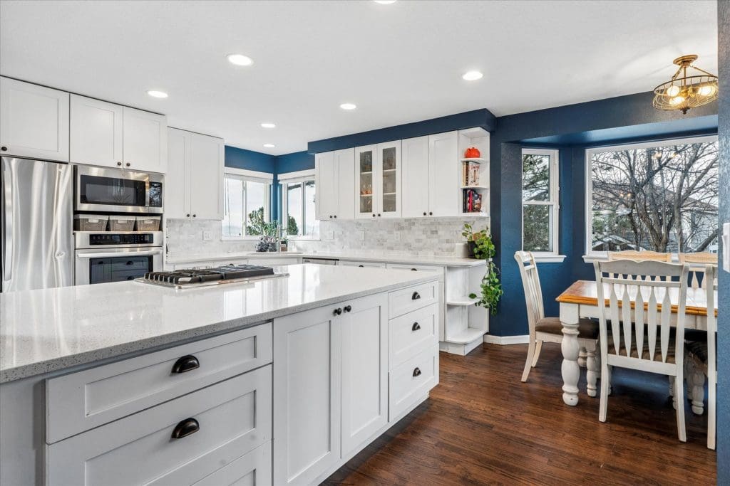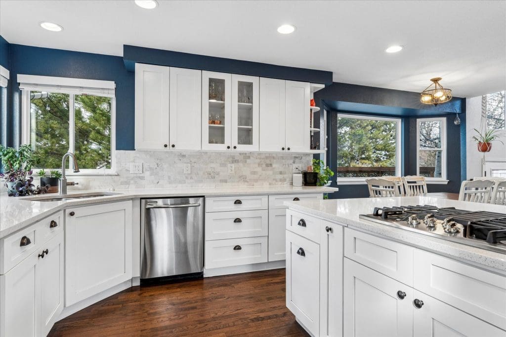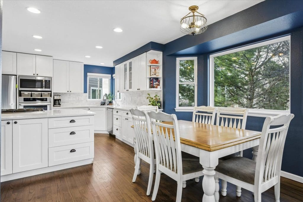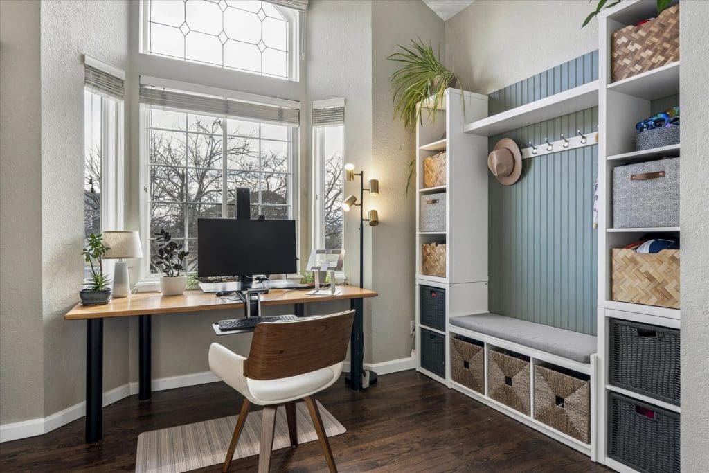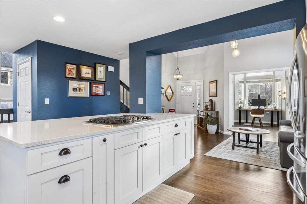 SPECTACULAR MOUNTAIN VIEWS!! A beautifully updated home on a premier cul-de-sac lot in Lone Tree. Sun-filled windows in various sizes nicely complement each room, creating a warm and welcoming feeling throughout. Gleaming hardwood flooring on main & lower levels. Open floor plan is ideal for entertaining and comfortable daily living. Cooking will be a pleasure in the Gourmet Dream Kitchen with windows capturing the AMAZING MOUNTAIN VIEWS. Abundance of attractive white cabinetry and countertops, including a huge island with 4 burner gas cooktop. Stainless appliances, pantry and spacious eating area surrounded by windows. Vaulted Dining Room and Main Floor Home Office (or 5th bedroom) with French doors, bay window and built-ins for storage. Dramatic 2-story Family Room has appealing architectural feature of several windows at different levels, gas fireplace with brick surround + hearth. Access to back deck. Laundry Room with built-in cabinets + updated bath on lower level. Primary Suite is pure luxury! French doors open to the vaulted bedroom with wood flooring. Gorgeous remodeled 5-piece bath has deep soaking tub, quartz countertops and walk-in with closet system. Bonus loft area ideal for study nook or reading area. 2 additional upstairs bedrooms complemented by wood flooring. Nicely served by updated bath with dual sinks, marble countertops & tile flooring. Handy built-in cabinets in hall provide added storage space. Extensive additional living space in the finished basement featuring a Rec Room, 4th bedroom and bath. Outdoor entertaining will be a treat on the newer low maintenance deck, which offers UNOBSTRUCTED VIEWS of our spectacular & colorful sunsets. Mounted outside TV included. Wonderful cul-de-sac location just steps from La Quinta Park, walking trails and neighborhood elementary school. A True Colorado Treasure!